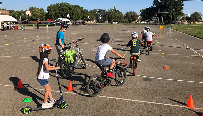 Being intentional about injury prevention is central to the Merced Bicycle Coalition's work. The "rodeos" instruct families how to navigate their small towns' largely sidewalk-less and bike lane-less streets as safely as possible, teaching turn signals, traffic laws, where to ride, and how to stop correctly. Participants bike through a safety course, which includes stop signs and railroad signs, before they graduate to practicing on the road with an instructor.